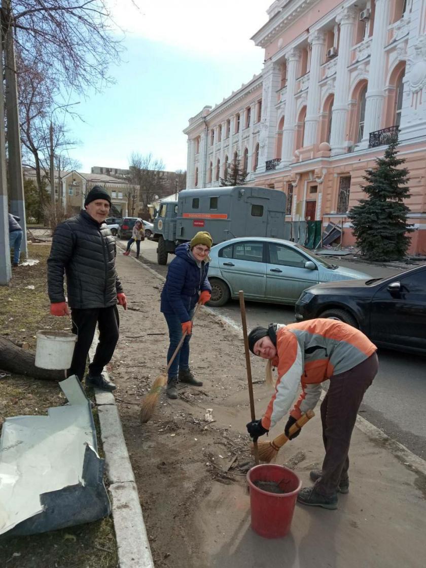 9 березня співробітники департаменту житлово-комунального господарства звернулися до харків'ян із проханням допомогти двірникам та іншим працівникам комунальних підприємств прибирати вулиці, які постраждали від артобстрілів та бомбардувань.