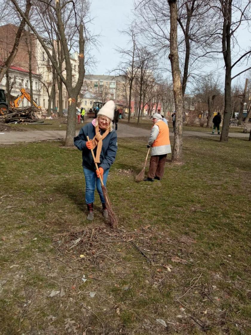 Для оперативної роботи у місті створили 9 волонтерських центрів — по одному у кожному районі. 28 березня на прибирання вийшли волонтери та працівники комунальних підприємств Основ'янського району. Вони працювали біля будівлі Адміністративного суду на площі Героїв Небесної Сотні.