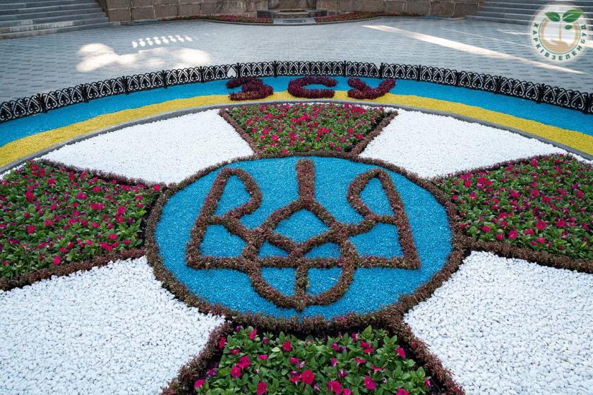 При створенні клумби використовували ірезину, малинову та блакитну петунії, коричневу альтернатеру, білий мармуровий камінь та жовто-блакитні мармурові крихти. У центрі композиції знаходиться герб України.