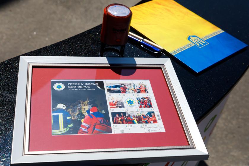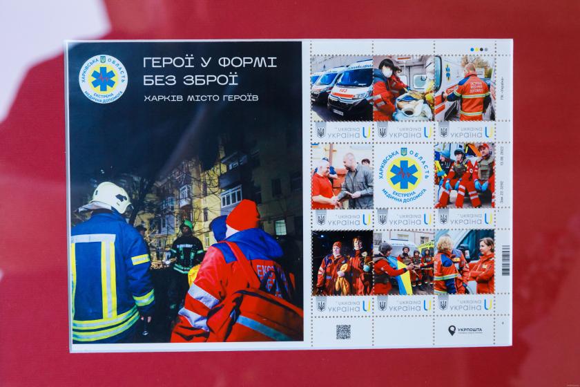 Поштові марки складаються з фотографій медиків "екстренки", які були зроблені під час повномасштабного вторгнення на Харківщині.