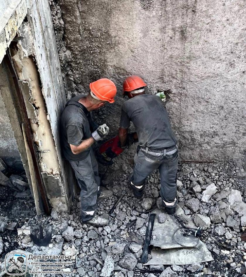 "Після влучання авіабомби було проведено детальне інструментальне обстеження будівлі, яке підтвердило: 8-й під’їзд перебуває в аварійному стані та підлягає демонтажу. Наразі вже розібрано близько 70% конструкцій цього під’їзду. Завершити роботи планується до кінця вересня", — повідомили у департаменті з благоустрою, відбудови та реконструкції Харківської міськради