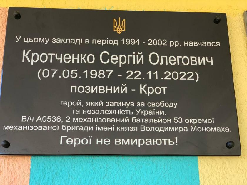 22 серпня на будівлі гімназії №42 відкрили меморіальну дошку добровольцю Сергію Кротченко. Він народився 7 травня 1987 року. Навчався у цій гімназії із 1994 по 2002 рік.