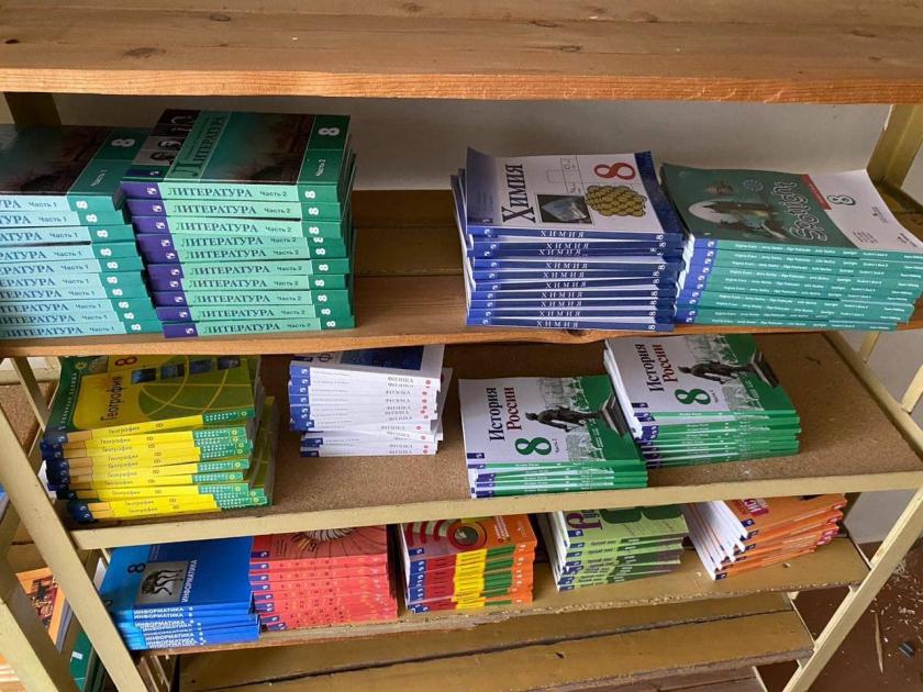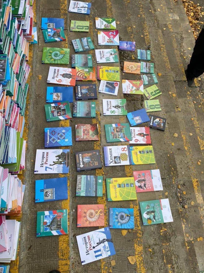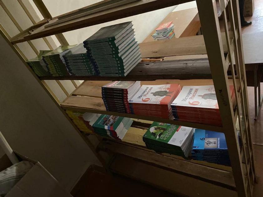 Зазначимо, на фото видно, що серед підручників, зокрема, є історія Росії (6 клас), російська мова (9 клас), читання (2 клас), біологія (10 клас).