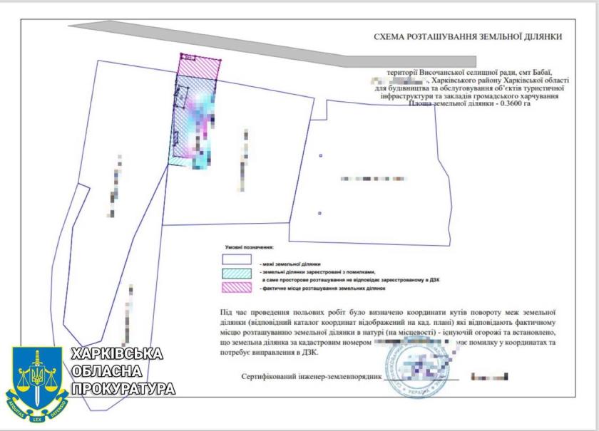 "Навесні 2023 року він замовив у інженера-землевпорядника технічну документацію щодо встановлення меж земельної ділянки в натурі для будівництва і обслуговування обʼєктів туристичної інфраструктури та закладів харчування. Інженер-землевпорядник спеціально та цілеспрямовано змінив координати поворотних точок меж земельних ділянок, змістивши їх на площу самовільно зайнятої земельної ділянки", — розповіли у Харківській обласній прокуратурі.