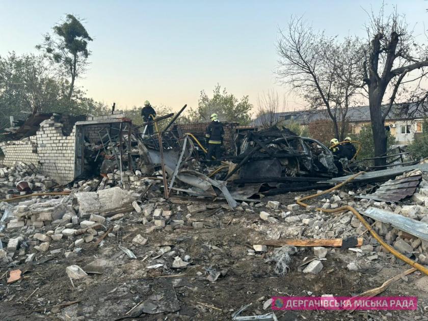 "Один удар прийшовся по гаражному кооперативу одного з мікрорайонів міста. Інше влучання прийшлося по відкритій території за межами міста — сталося загоряння трави та гілля на площі 1000 кв. м. Профільні служби працюють над ліквідацією пожежі. За медичною допомогою звернулися чоловіки 44 та 29 років, дівчина 23 років та хлопчик 14 років. Місцеві жителі зазнали осколкових поранень. Гострої реакції на стрес зазнали жінки 74 та 51 років, а також дівчина 19 років. На даний момент їхньому життю нічого не загрожує", — повідомив начальник Дергачівської міської військової адміністрації Вячеслав Задоренко.