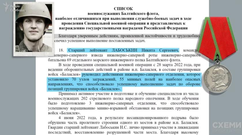 У списку представлених до нагород є 28-річний Нікіта Лабоськін зі Смоленської області, командир інженерно-саперного взводу 69-го окремого морського інженерного полку Балтійського флоту. Він керував відділенням, яке зробило 70 вузлів загороджень і 55 мінних полів на "найнебезпечніших напрямках". За це йому пропонувалося надати медаль Суворова.