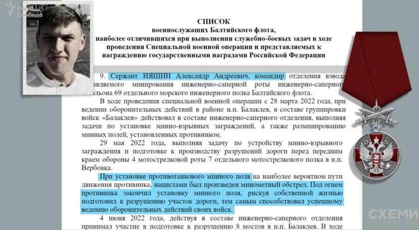 Наступний окупант, якого пропонували нагородити за мінування Харківської області, — Олександр Няшин. Йому — 24 роки, родом із Тюменської області. Журналісти "Схем" намагалися зв'язатися із Няшиним та Лабоськіним, проте цього не вдалося.