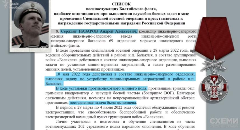 Медаль ордену "За заслуги перед Вітчизною" II ступеня хотіли дати командиру відділення роти 69-го окремого морського інженерного полку Андрію Назарову. Він живе у Калінінграді, йому — 28 років. На флешкартці про нього написано, що він виконував завдання з облаштування мінно-вибухових загороджень у районі Балаклії, під час встановлення протипіхотного мінного поля завдання виконав. Журналісти зв'язалися з Назаровим телефоном. Проте, коли той почув запитання, кинув слухавку.