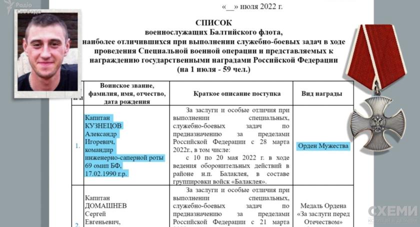 За даними журналістів, усіма окупантами, які представлені до нагород і про яких ідеться на цій флешкартці, командував Олександр Кузнєцов. Цьому загарбнику 33 роки, родом із Тюменської області, командир інженерно-саперної роти 69-го полку. Йому пропонувалося дати "Орден мужності". Заслугою окупанта називають "встановлення десятків мінних полів і загороджень", "особисту участь у підготовці та навчанні фахівців". За інформацією із флешкартки, він підготував три позаштатних інженерно-саперних відділення. Із Кузнєцовим розслідувачі зв'язалися.