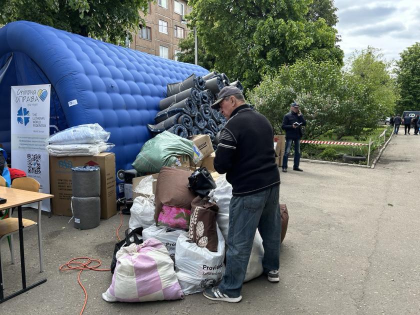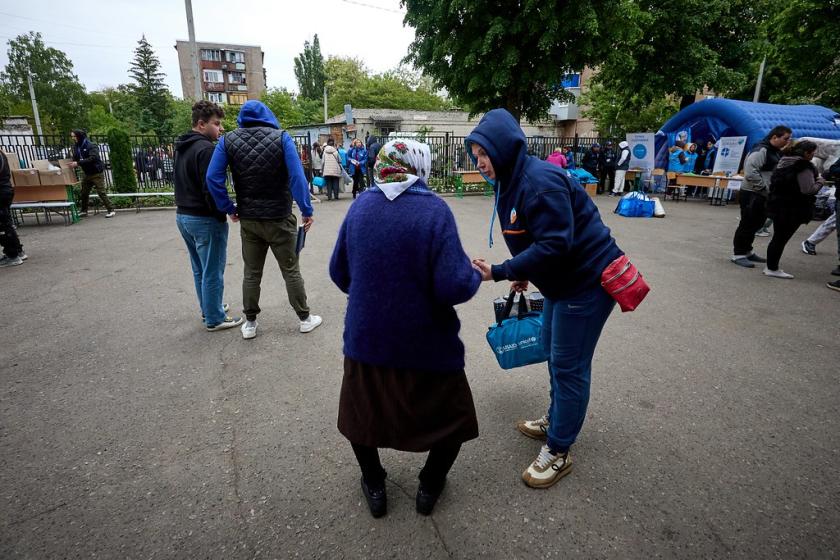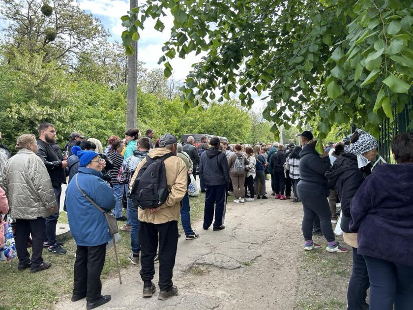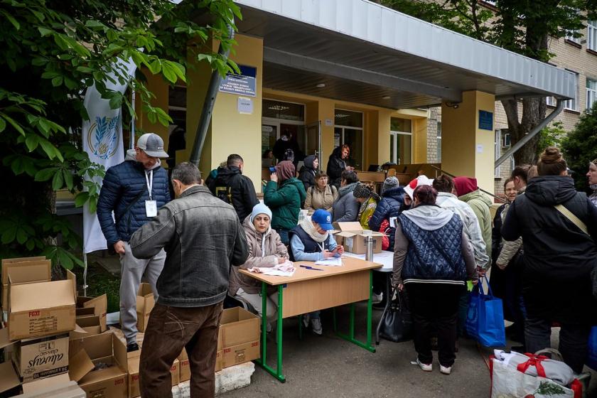 Біля школи в районі ХТЗ від ранку припарковані десятки автомобілів, близько сотні людей стоять в черзі — це ті, хто з 10 травня виїхав самотужки, а зараз намагається отримати матеріальну допомогу та, можливо, місце в гуртожитку — із цим є проблема, бо вони закінчуються. Пенсіонерка Софія Володимирівна стоїть в черзі понад дві години — вона ще в неділю виїхала з рідних Липців до Циркунів, а звідти вже до Харкова.