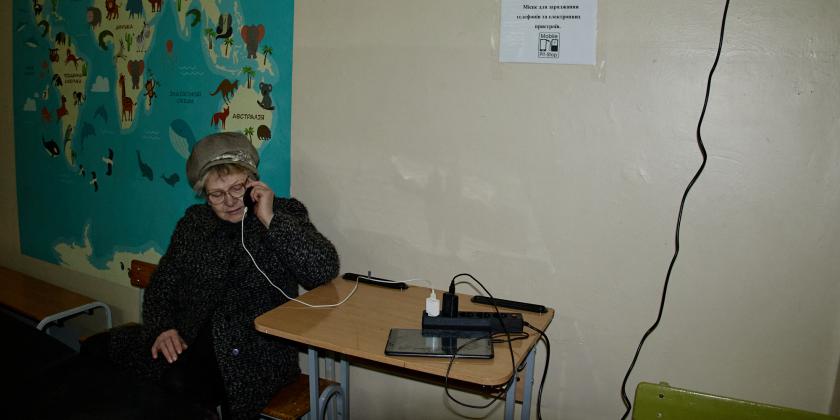 Час для візиту у 107 та 139-ту школи видався влучним: вимкнули світло у декількох мікрорайонах. У 107-й школі на "Пісках", що неподалік від двох станцій метро — "Студентська" та "Героїв праці" — людей незатишного вечора останнього дня осені мало: три жінки та дівчинка років 8-9. Жінки заряджають телефони, дівчинка в очікуванні мами складає пазли. Всі вже не перший раз тут користуються можливістю поповнити пристрої, поки в оселях немає світла.