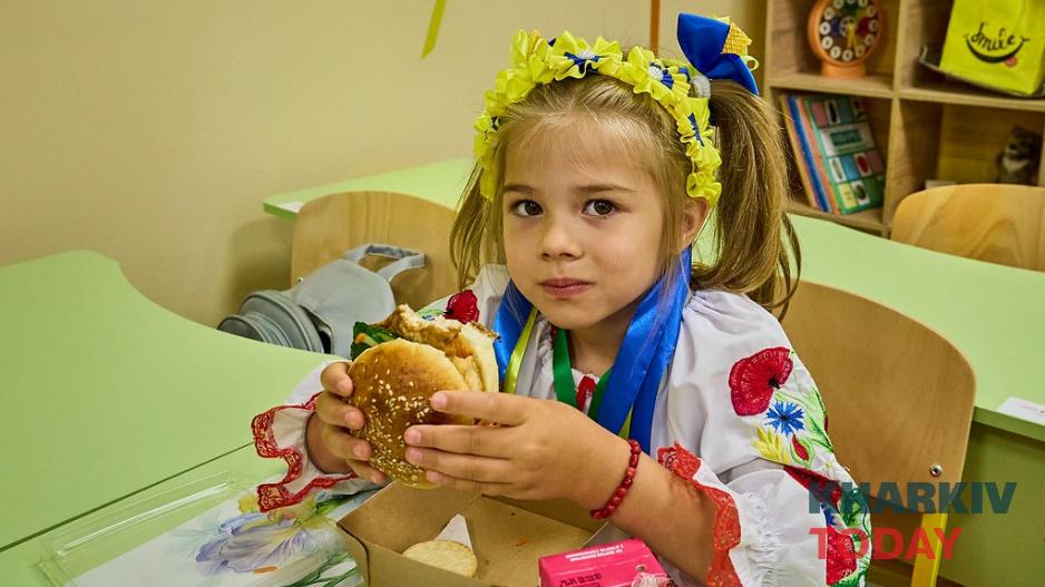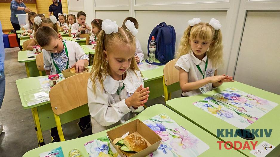 Лунає дзвоник, але цього разу на перерву діти не йдуть: їм принесли обід. Сьогодні в меню — бургер та сік. Їдять в класах за партами, але якщо зголодніють, то можуть вийти в кафетерій та купити пиріжок, воду, бутерброд чи інший перекус. Ціни доступні, наприклад, пиріжки коштують 12-15 гривень.