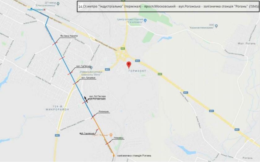 - залізнична станція "Рогань" — метро "Індустріальна";