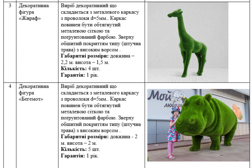 Зокрема, комунальники куплять фігури слонів (5 фігур), ведмедів (5 фігур), бегемотів (5 фігур), носорогів (5 фігур), жирафів (4 фігури) і динозавра (1 фігура).