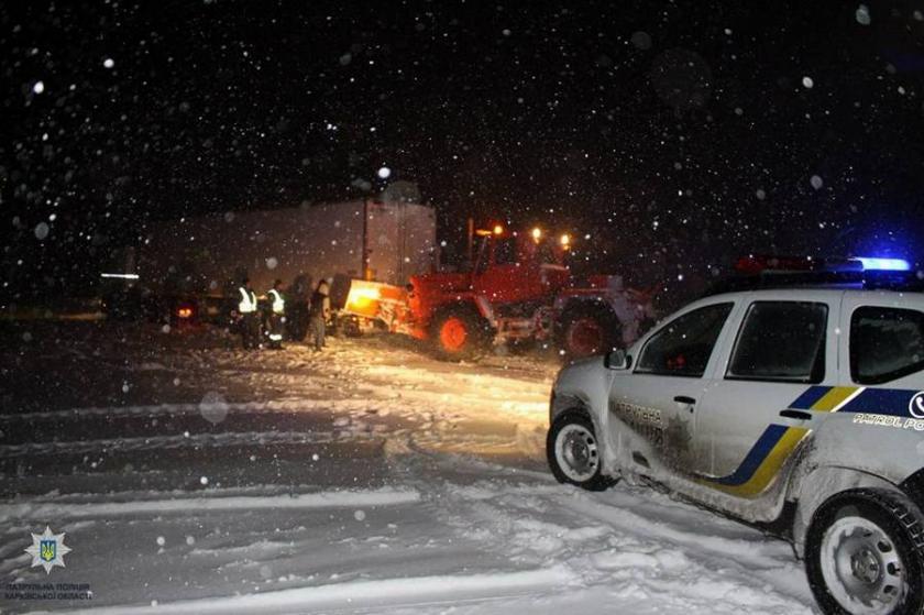 По данным патрульной полиции, из снежных заметов за ночь освободили 10 грузовиков совместно с сотрудниками службы автомобильных дорог.