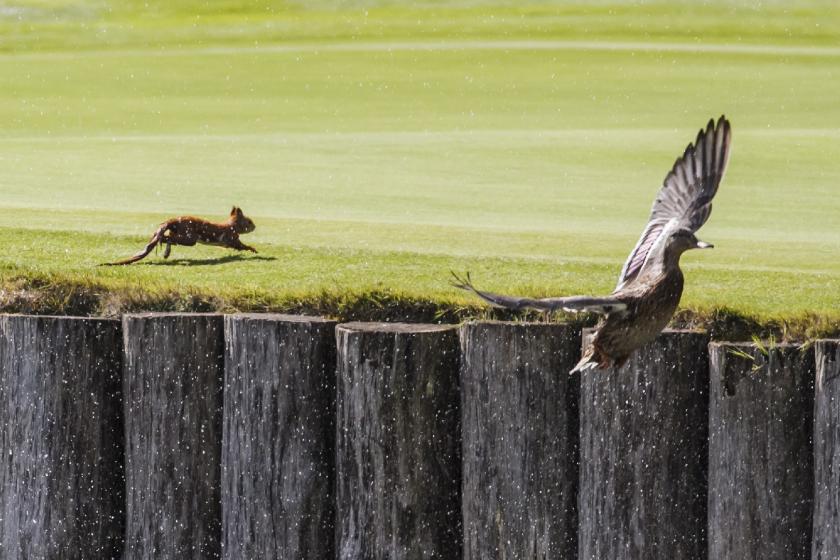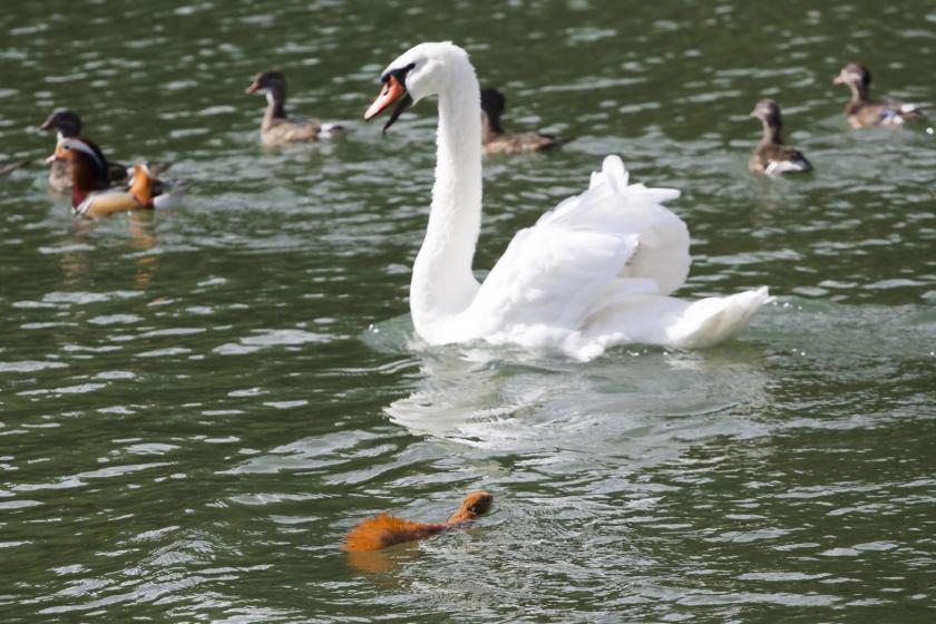 Одна из выпущенных белок прыгнула в пруд и поплыла, вызвав недовольство хозяина водоема - белого лебедя. Птица начала шипеть на непрошеного гостя. Водные процедуры для рыжей закончились благополучно - она выплыла на другом берегу озера. Получившие свободу белки разбежались по территории гольф-клуба.