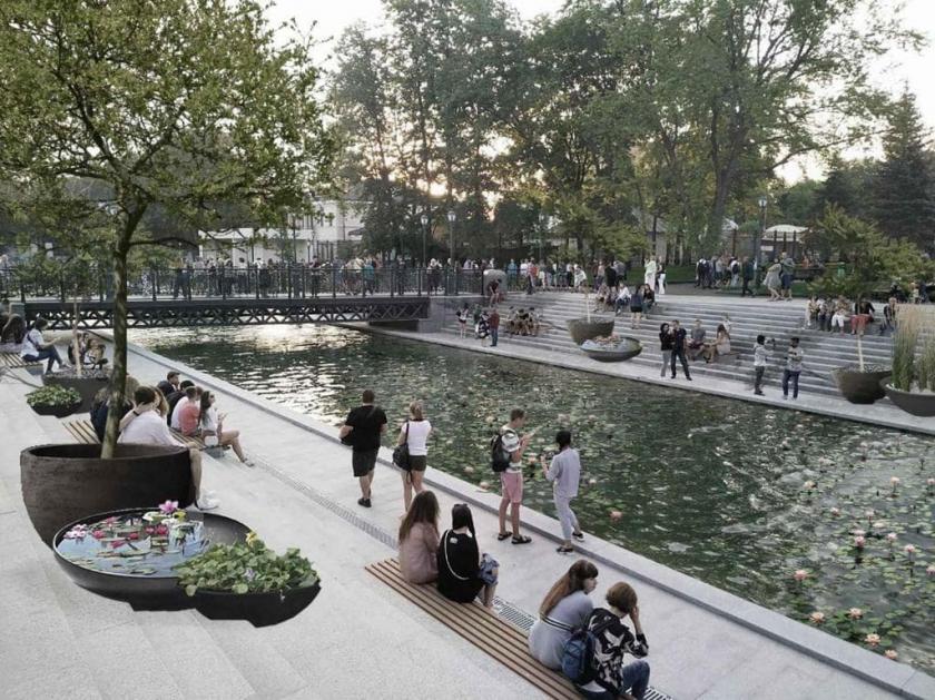 В саду имени Шевченко рабочие второй день монтируют чугунные вазоны, внутри которых будут деревья. KHARKIV Today побывал на месте проведения работ. По обеим сторонам "озера" устанавливают 21 гигантский вазон разного диаметра.
