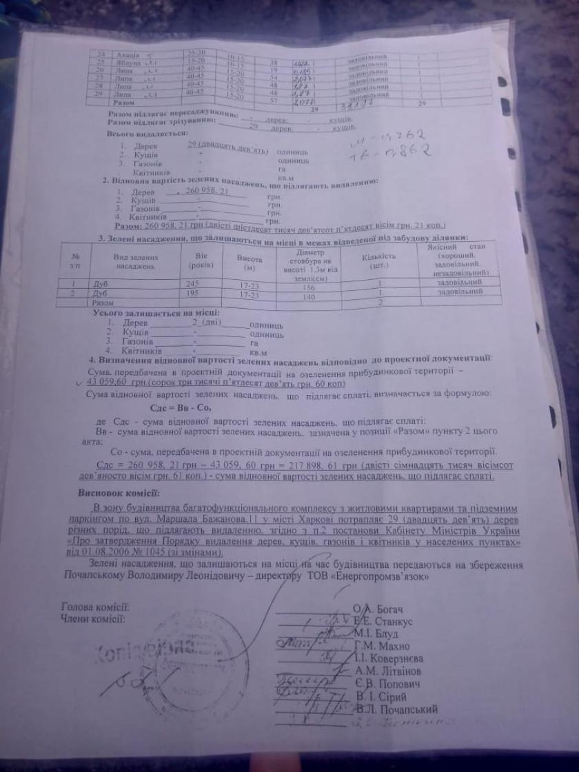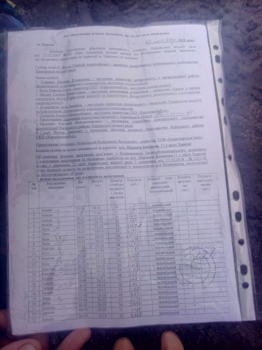 По просьбе патрульных полицейских, сотрудники коммунального предприятия предъявили разрешительные документы на проведение работ — один из бригадиров показал сотрудникам "Акт обследования зеленых насаждений, которые подлежат удалению", в котором сказано, что снос деревьев связан со строительством многофункционального комплекса с жилыми квартирами и подземным паркингом. Соответствующее решение приняла комиссия исполкома Харьковского городского совета во главе с директором коммунального хозяйства Алексеем Богачем в октябре 2018 года.